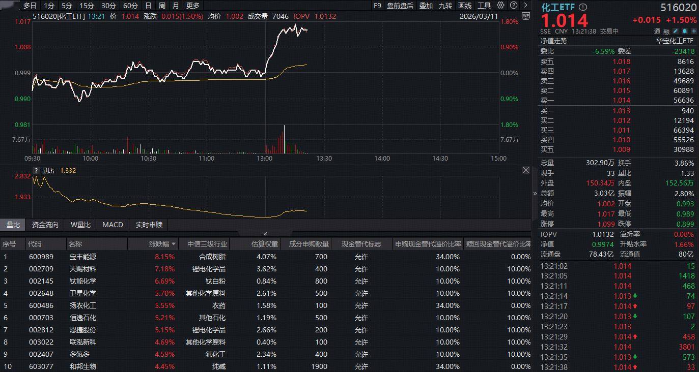 化工板块今日(3月11日)午后突然猛拉,截至发稿,反映化工板块整体走势的化工ETF(516020)场内价格大涨1.5%。