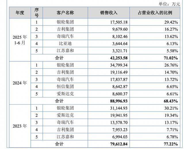 报告期内,朗信电气对前五大客户的销售额占营业收入的比例分别为83.08%、77.22%、68.43%和71.02%,占比较高。其中,公司对第一大客户银轮集团的销售额占营业收入的比例分别为33.36%、30.21%、26.76%和29.42%。
