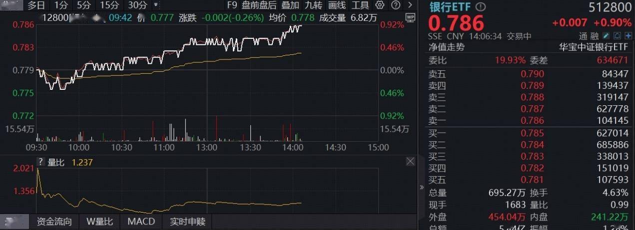 3月11日,银行下探回升,后单边向上,截至发稿,全市场规模最大银行ETF(512800)场内价格现涨近1%。个股大面积飘红,渝农商行涨近2%,瑞丰银行、上海银行、成都银行、杭州银行等涨超1%。