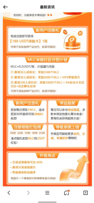 平台以每月20%-30%的收益回报为诱饵,还推出“注册送188 USDT体验卡”等福利吸引用户注册,同时设置明确的拉新奖励机制——邀请50人可获得5000 MLC币及VIP特权,邀请100人可享受3%的永久分红。