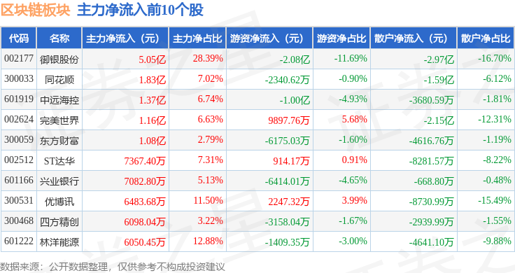 从资金流向上来看,当日区块链板块主力资金净流出57.14亿元,游资资金净流入2.64亿元,散户资金净流入54.5亿元。区块链板块个股资金流向见下表: