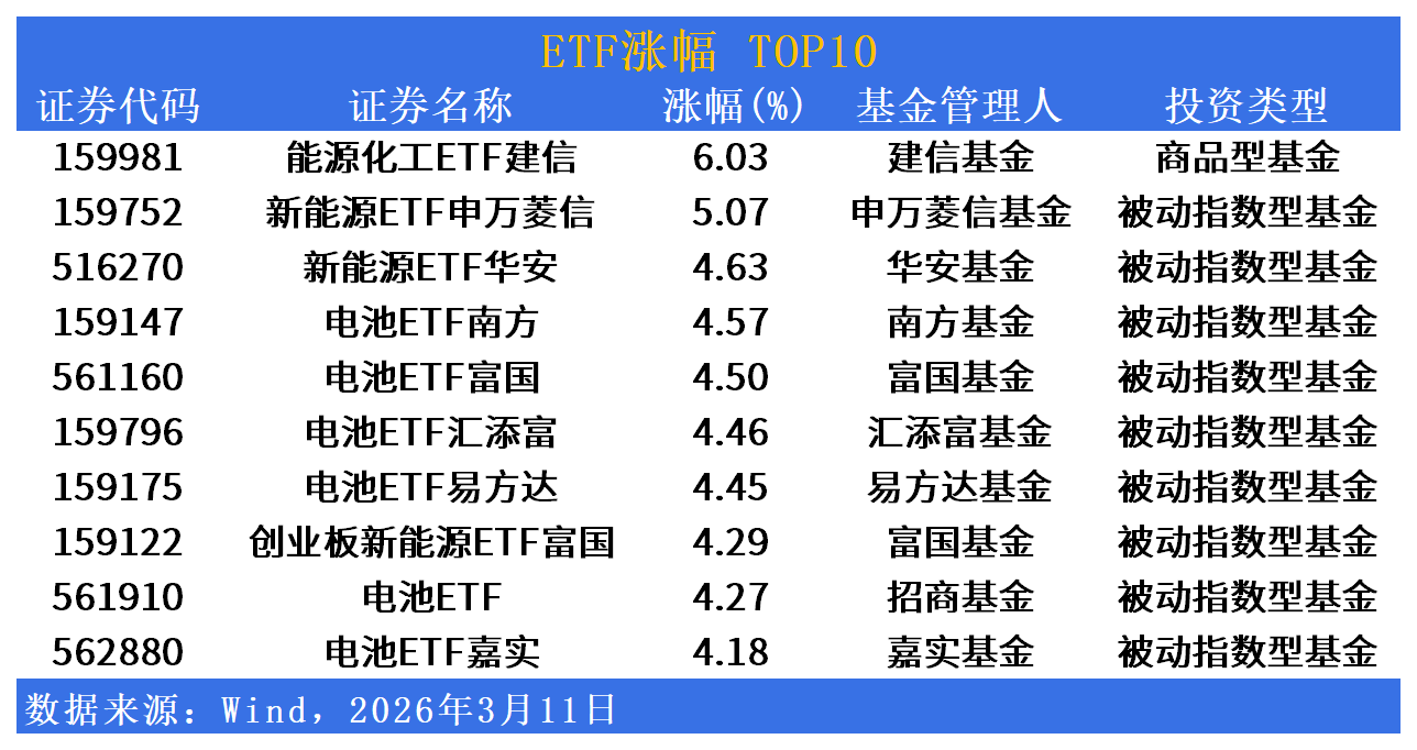 涨幅方面,能源化工ETF飙升逾6%,新能源与电池板块批量上涨