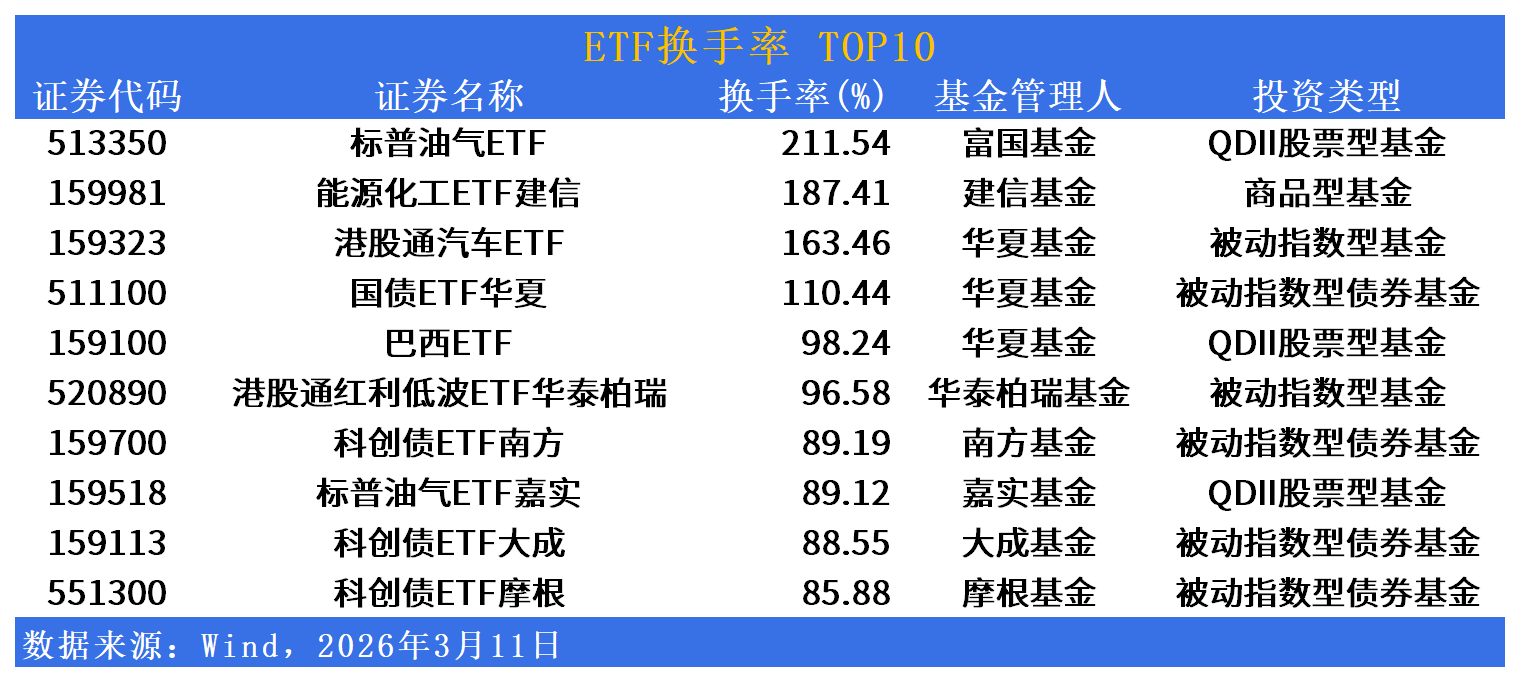 换手率维度,标普油气ETF(513350)换手率211.54%居首,能源化工ETF建信(159981)换手率187.41%,港股通汽车ETF(159323)换手率163.46%,国债ETF华夏(511100)换手率110.44%,巴西ETF(159100)换手率98.24%,港股通红利低波ETF华泰柏瑞(520890)换手率96.58%,科创债ETF南方(159700)换手率89.19%,标普油气ETF嘉实(159518)换手率89.12%,科创债ETF大成(159113)换手率88.55%,科创债ETF摩根(551300)换手率85.88%,跨境商品与债券品种流动性维持高位。