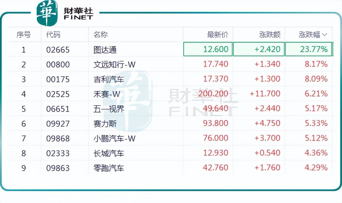 其中,图达通(02665.HK)大涨23.77%,文远知行-W(00800.HK)涨8.17%,禾赛-W(02525.HK)涨6.21%,五一视界(06651.HK)、塞力斯(09927.HK)均涨超5%,黑芝麻智能(02533.HK)、小马智行-W(02026.HK)也都加入这波上涨浪潮。