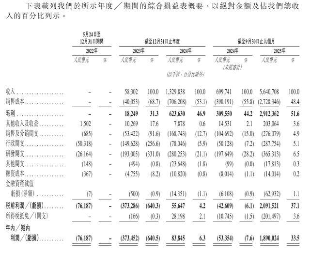 2024年前九个月和2025年前九个月,公司的营业收入分别为人民币6.997亿元和56.41亿元,同比增长超7倍;相应的净利润分别为人民币-0.53亿元和18.90亿元。毛利率也从2023年的31.3%提升至2025年前九月的 51.6%。