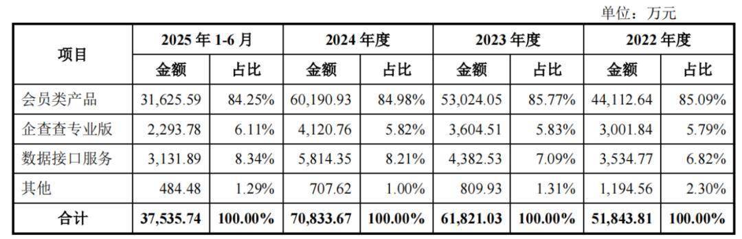 其中,VIP会员作为最早商业化的产品,是企查查的业务基本盘。2022年至2024年,公司会员类产品收入由4.41亿元增长至6.02亿元,收入占比在85%左右。