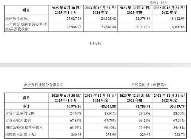 随着业务的持续发展,企查查预收会员服务费等业务收款金额持续增长。期内,公司合同负债余额、一年内到期的非流动负债余额(预收款项)合计分别为3.5亿元、4.28亿元、4.8亿元及5.1亿元,占营业收入的比例分别为67.54%、69.21%、67.79%及67.89%。