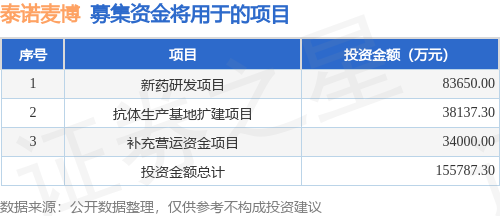 证券之星消息,珠海泰诺麦博制药股份有限公司(简称:泰诺麦博)拟在上交所科创板上市,募资总金额为15.0亿元,保荐机构为华泰联合证券有限责任公司。募集资金拟用于新药研发项目、抗体生产基地扩建项目、补充营运资金项目,详见下表: