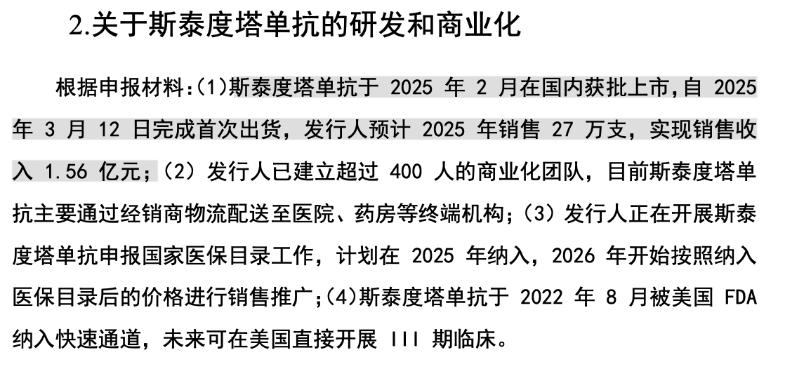 根据招股书,公司于2025年3月开始销售斯泰度塔单抗注射液,实现药品销售收入5122.49万元。