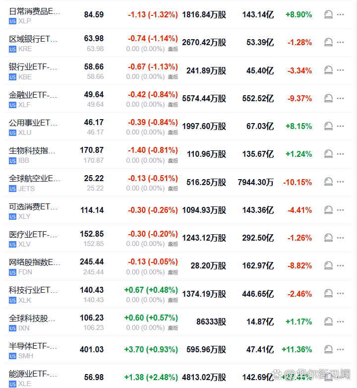 【日常消费品板块手得超1.3%,领跌美股行业ETF,能源业ETF涨约2.5%】周三(3月11日),日常消费品板块收跌1.32%,区域银行ETF、银行业ETF至少跌1.13%,金融业ETF跌0.84%,科技行业ETF则收涨0.48%,全球科技股指数ETF涨0.57%,半导体ETF涨0.93%,能源业ETF涨2.48%。