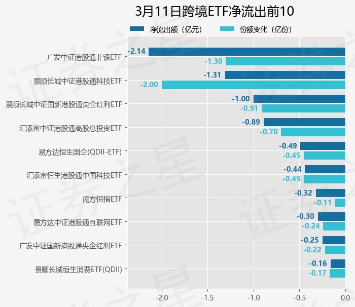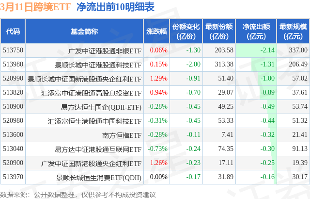 当日有26只跨境ETF基金出现资金净流出,其中净流出排首位的是广发中证港股通非银ETF(513750),份额减少了1.3亿份,净流出额为2.14亿元。