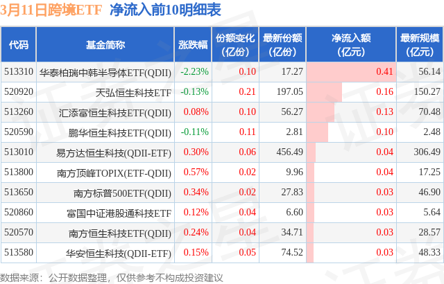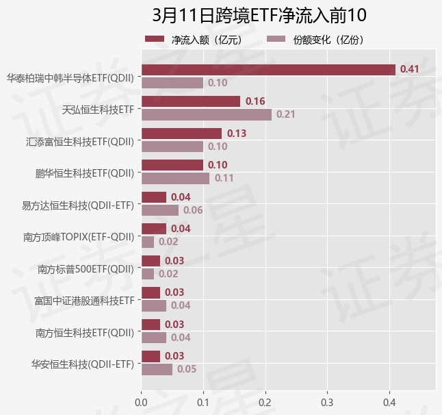 当日有29只跨境ETF基金出现资金净流入,其中净流入排首位的是华泰柏瑞中韩半导体ETF(QDII)(513310),份额增加了1000.0万份,净流入额为4095.64万元。