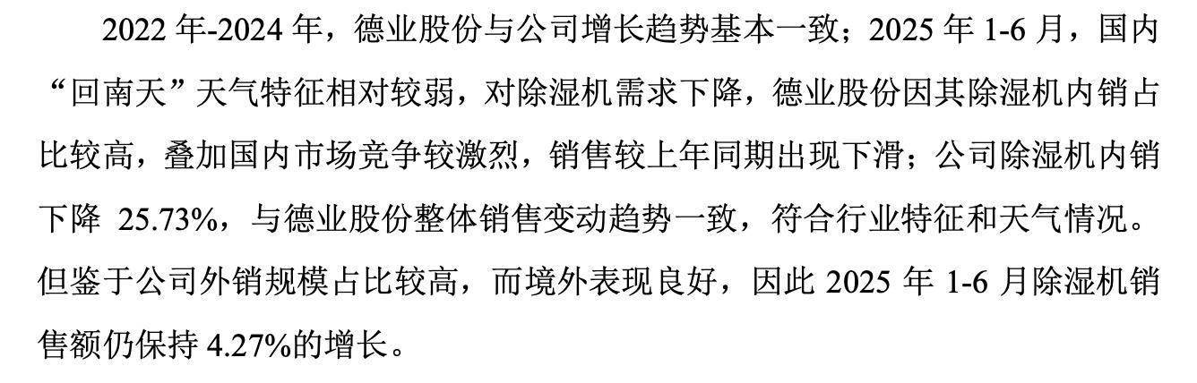 2022年-2024年,德业股份与公司增长趋势基本一致;2025年1-6月,国内 “回南天”天气特征相对较弱,对除湿机需求简降,德业股份因其除湿机内销占比较高,叠加国内市场竞争较激烈,销售较上年同期出现简滑;公司除湿机内销简降25.73%,与德业股份整体销售变动趋势一致,符合行业特征和天气情况。但鉴于公司外销规模占比较高,而境外表现良好,因因此2025年1-6月除湿机销售额仍保持4.27%的增长。
