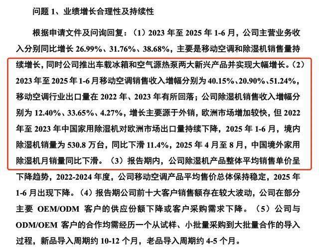 根据申请文件及问询回复:2023年至2025年1-6月,公司主营业务收入分别同比增长26.99%、31.76%、38.68%,主要是移动空调和除湿机销售量持续增长,同时公司推出车载冰箱和空气源热泵两大新兴产品并实现大幅增长。
