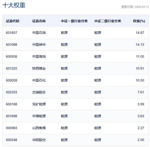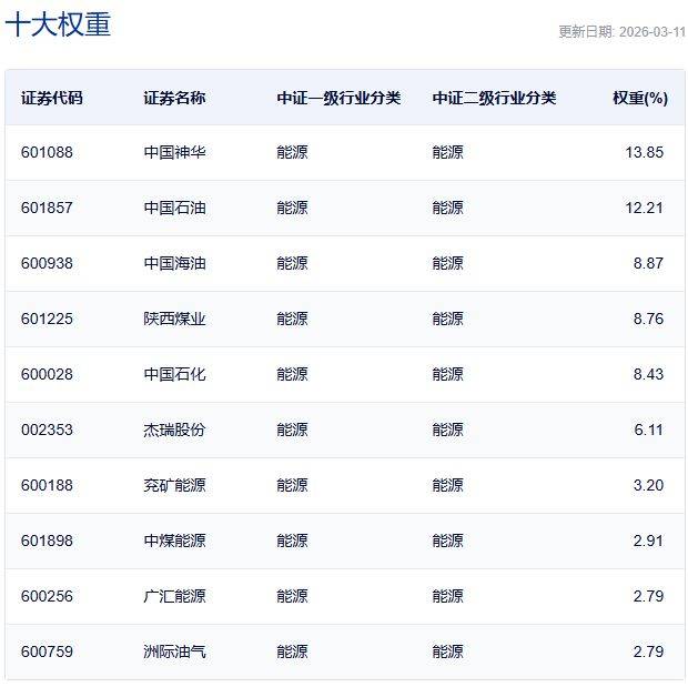 中证全指能源指数主要权重股