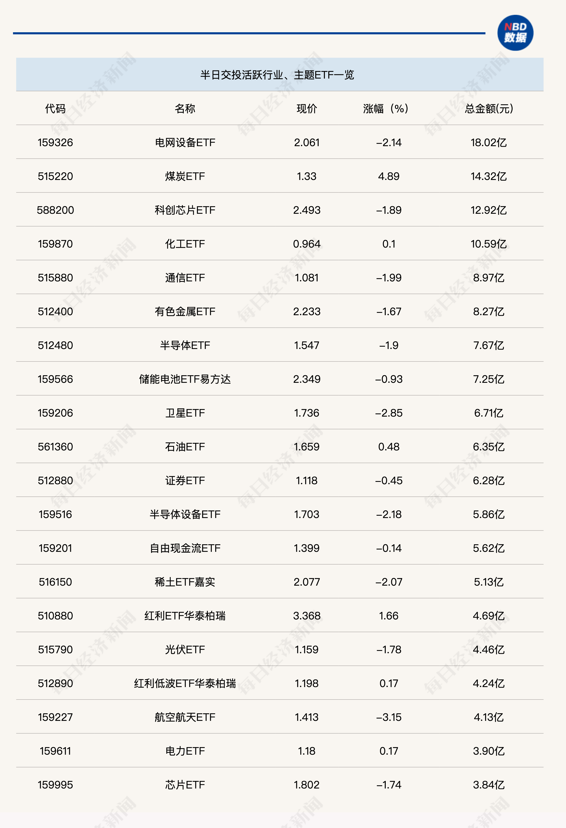 今日上午,电网设备ETF(159326)半日成交金额达到18.02亿元;煤炭ETF(515220)显著放量,半日成交金额达14.32亿元。跨境ETF方面,今日暂无一只ETF半日成交金额超过30亿元,缩量明显。