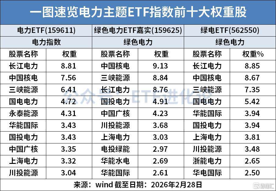 电力ETF跟踪中证全指电力公用事业指数,覆盖火电、水电、核电等全电力板块,成份股以行业龙头为主,前十大含长江电力、中国核电、三峡能源等。