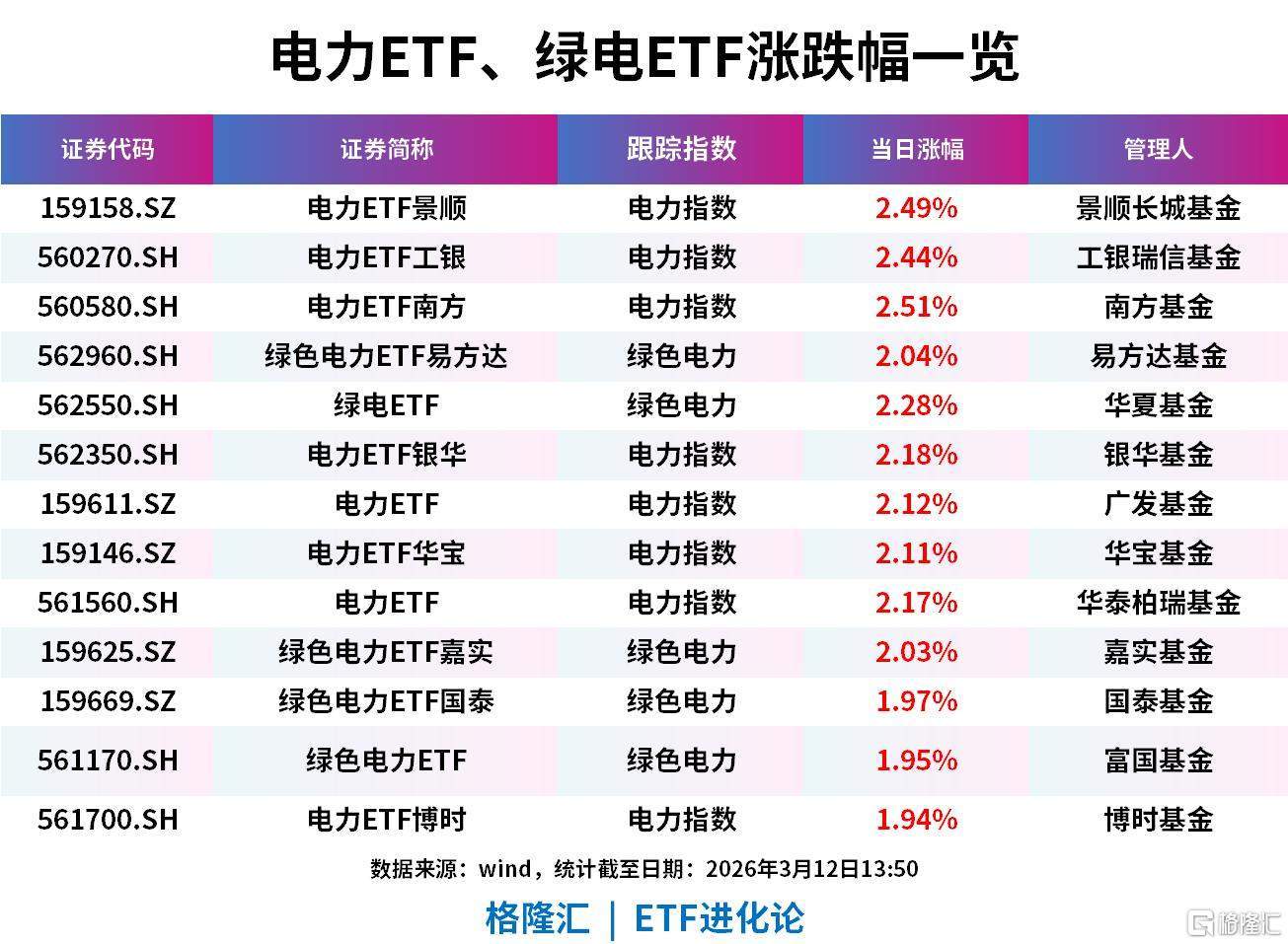 绿电ETF跟踪中证绿色电力指数,选取50家绿电领域标的,覆盖风光水核及火电转型企业,前十大含长江电力、中国核电、国电电力、三峡能源等龙头。