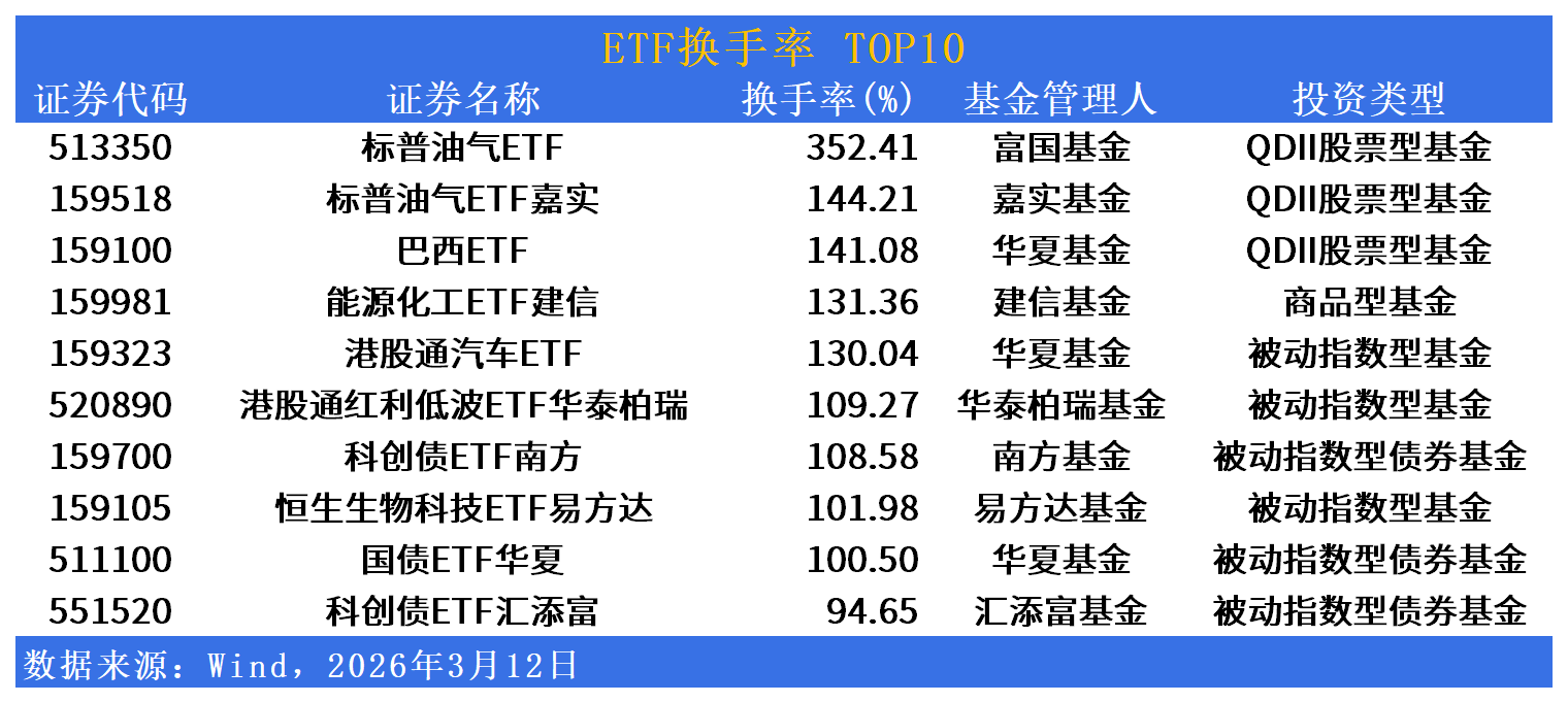 换手率维度,标普油气ETF(513350)换手率352.41%居首,标普油气ETF嘉实(159518)换手率144.21%,巴西ETF(159100)换手率141.08%,能源化工ETF建信(159981)换手率131.36%,港股通汽车ETF(159323)换手率130.04%,港股通红利低波ETF华泰柏瑞(520890)换手率109.27%,科创债ETF南方(159700)换手率108.58%,恒生生物科技ETF易方达(159105)换手率101.98%,国债ETF华夏(511100)换手率100.50%,科创债ETF汇添富(551520)换手率94.65%,跨境商品与债券品种交投高度活跃。