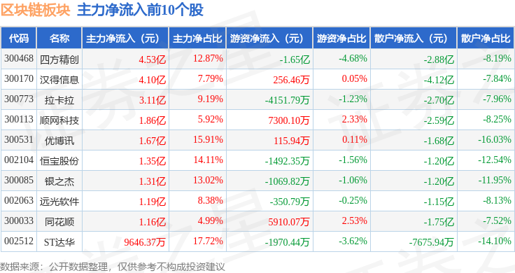 从资金流向上来看,当日区块链板块主力资金净流出33.16亿元,游资资金净流入2.7亿元,散户资金净流入30.46亿元。区块链板块个股资金流向见下表:
