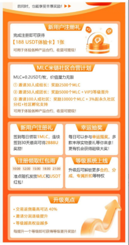邀请30人可成为组长,获2500个MLC币;邀请50人升级团长,得5000个MLC币+VIP3特权;邀请100人组建社区,可获10000个MLC币+3%起永久社区分红+孵化支持。