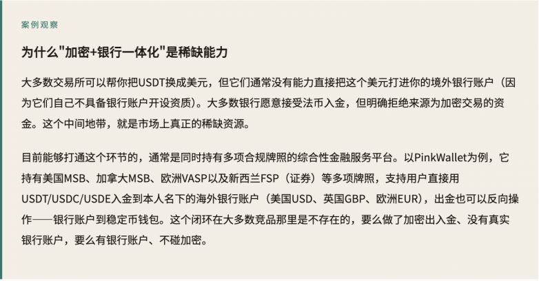 要合规地把稳定币换成法定货币并入账到银行账户,你需要的是一个同时持有加密资产业务许可(比如欧洲VASP)和传统金融业务许可(比如美国MSB)的机构来做这个转换。这两种牌照同时具备的机构,全球范围内也是少数。