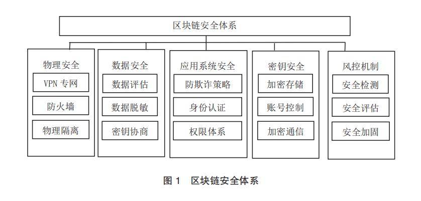 区块链安全体系结构如图 1 所示,涵盖了物理安全、数据安全、应用系统安全、密钥安全、风控机制等多个方面[5]
