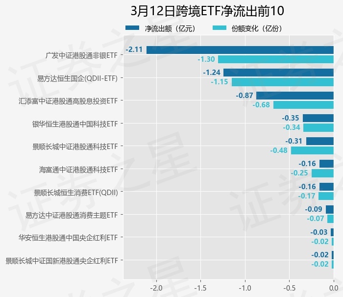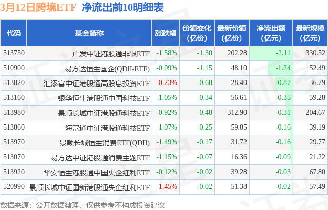 当日有14只跨境ETF基金出现资金净流出,其中净流出排首位的是广发中证港股通非银ETF(513750),份额减少了1.3亿份,净流出额为2.11亿元。
