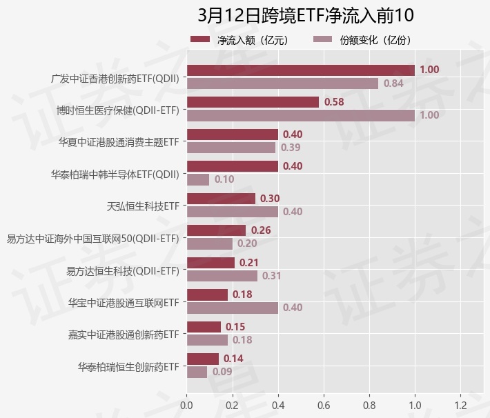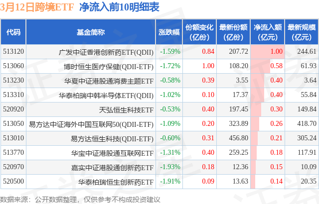 当日有44只跨境ETF基金出现资金净流入,其中净流入排首位的是广发中证香港创新药ETF(QDII)(513120),份额增加了8450.0万份,净流入额为1.0亿元。