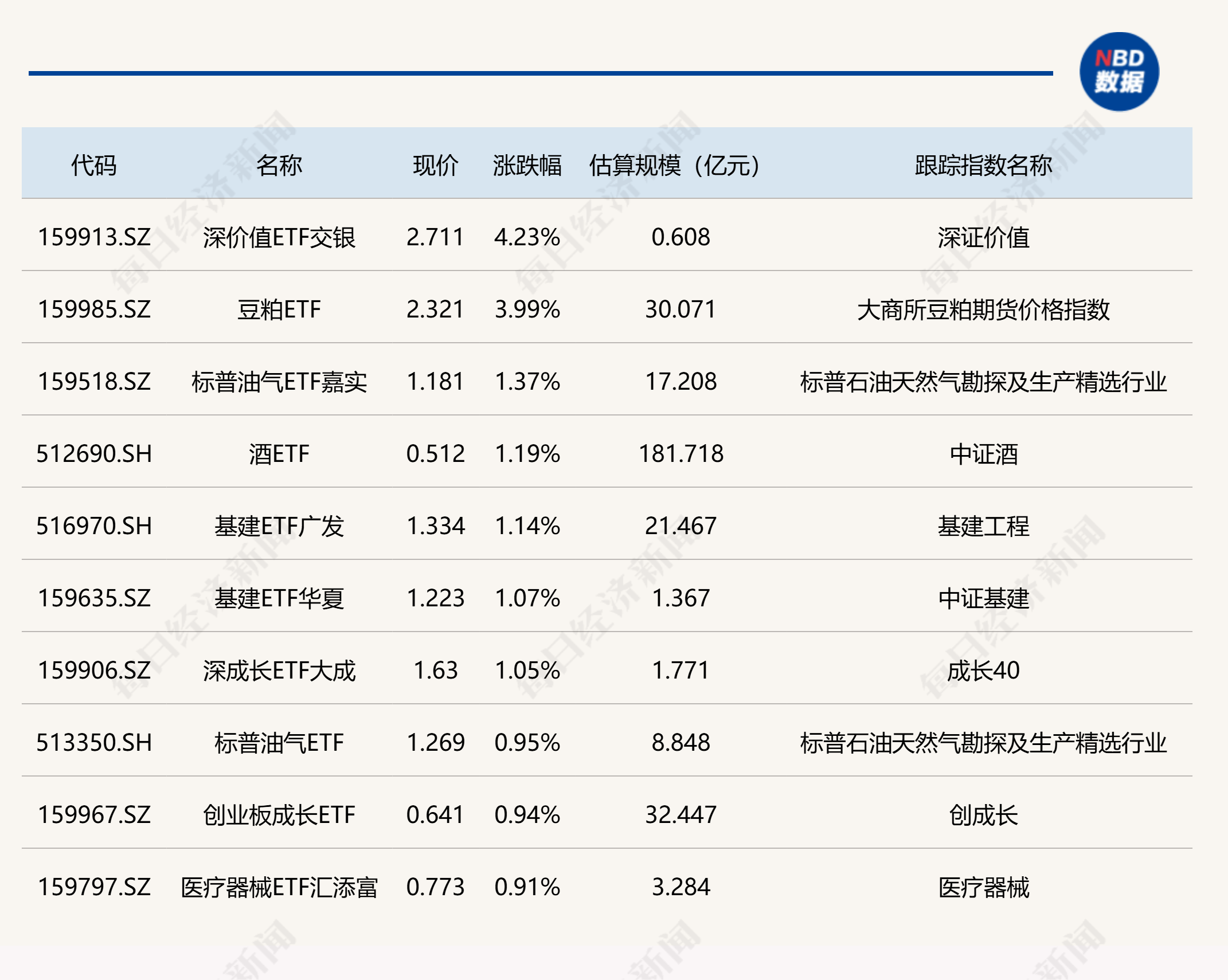 ETF涨跌幅方面,深价值ETF交银尾盘拉升逾4%,豆粕ETF涨近4%。