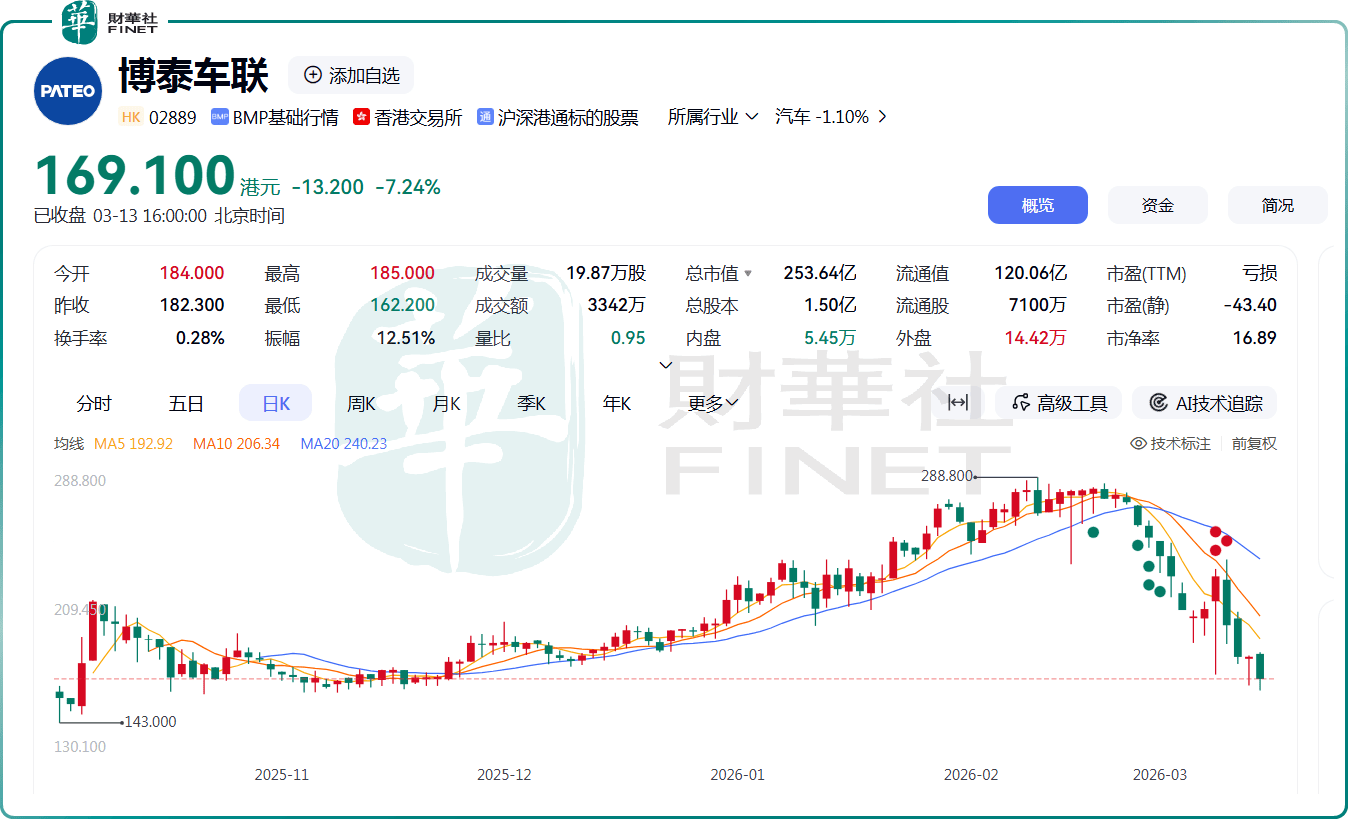 3月13日,博泰车联(02889.HK)再度跳水,截至收盘,跌幅为7.24%,报169.1港元/股,市值缩水至253.64亿港元。自2月下旬以来,公司股价持续疲软,不到一个月时间,累计跌幅约4成,资金抛售出逃迹象明显。