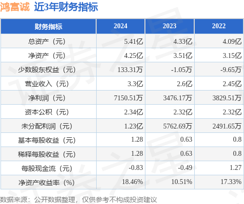 从目前公布的财报来看,鸿富诚2024年总资产为5.41亿元,净资产为4.25亿元;近3年净利润分别为7150.51万元(2024年),3476.17万元(2023年),3829.51万元(2022年)。详情见下表: