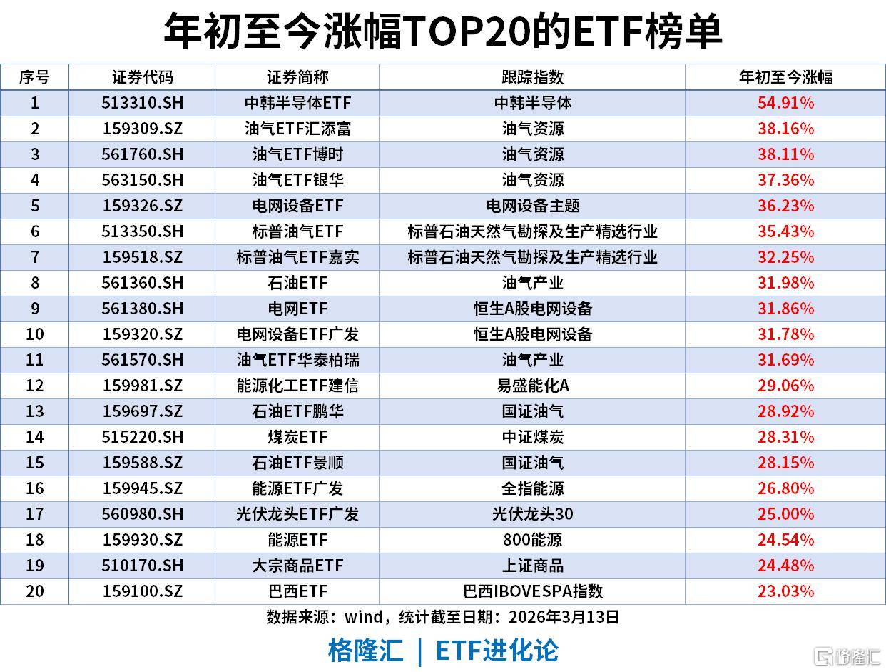 年初至今领涨品种:中韩半导体ETF以54.91%的巨大涨幅遥遥领先,成为年度最强ETF。