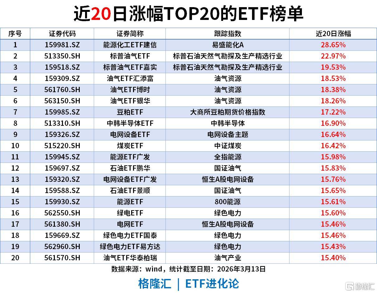 板块分布:能源相关ETF霸榜,油气类(含标普油气、油气资源、油气产业等)共9只,电网设备/绿色电力类共6只,能源化工、豆粕、煤炭等品种也在列。