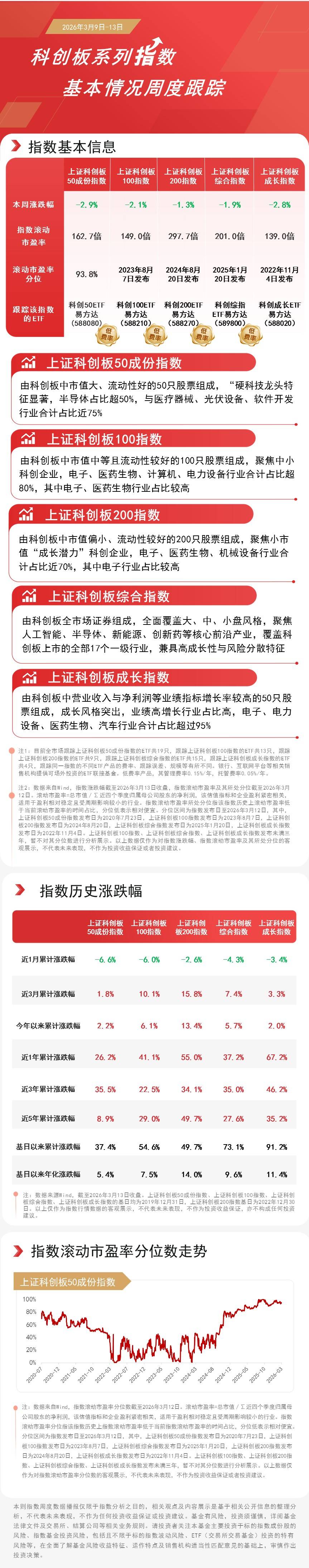 本周,科创200指数下跌1.3%,科创综指下跌1.9%,科创100指数下跌2.1%,上证科创板成长指数下跌2.8%,上证科创板50成份指数下跌2.9%。
