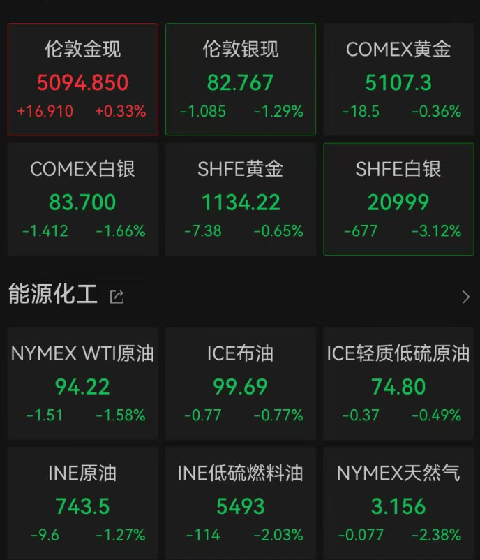 大宗商品方面,国际油价下挫,布油每桶报99.69美元,WTI原油每桶报94.22美元。