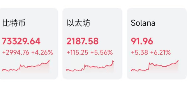 加密货币市场全线大涨,比特币突破73000美元/枚。截至发稿,比特币涨超4%,以太坊涨超5%。