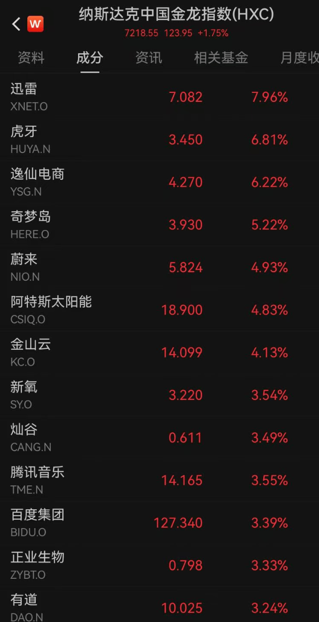 热门中概股走高,纳斯达克中国金龙指数涨1.75%,迅雷涨8%,蔚来涨5%,腾讯音乐涨3.55%,百度集团涨3.39%,阿里巴巴、京东涨超1%。