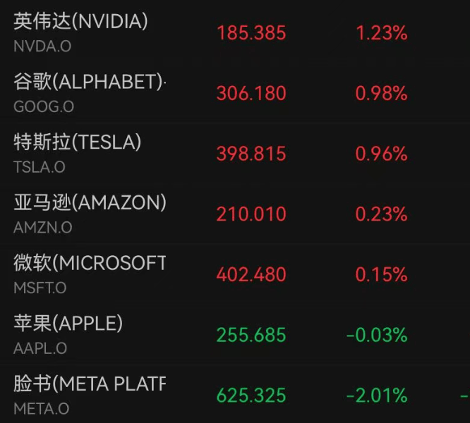 美股科技七巨头中,英伟达涨超1%,脸书跌2%。