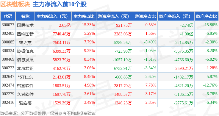 从资金流向上来看,当日区块链板块主力资金净流出92.39亿元,游资资金净流入14.29亿元,散户资金净流入78.1亿元。区块链板块个股资金流向见下表: