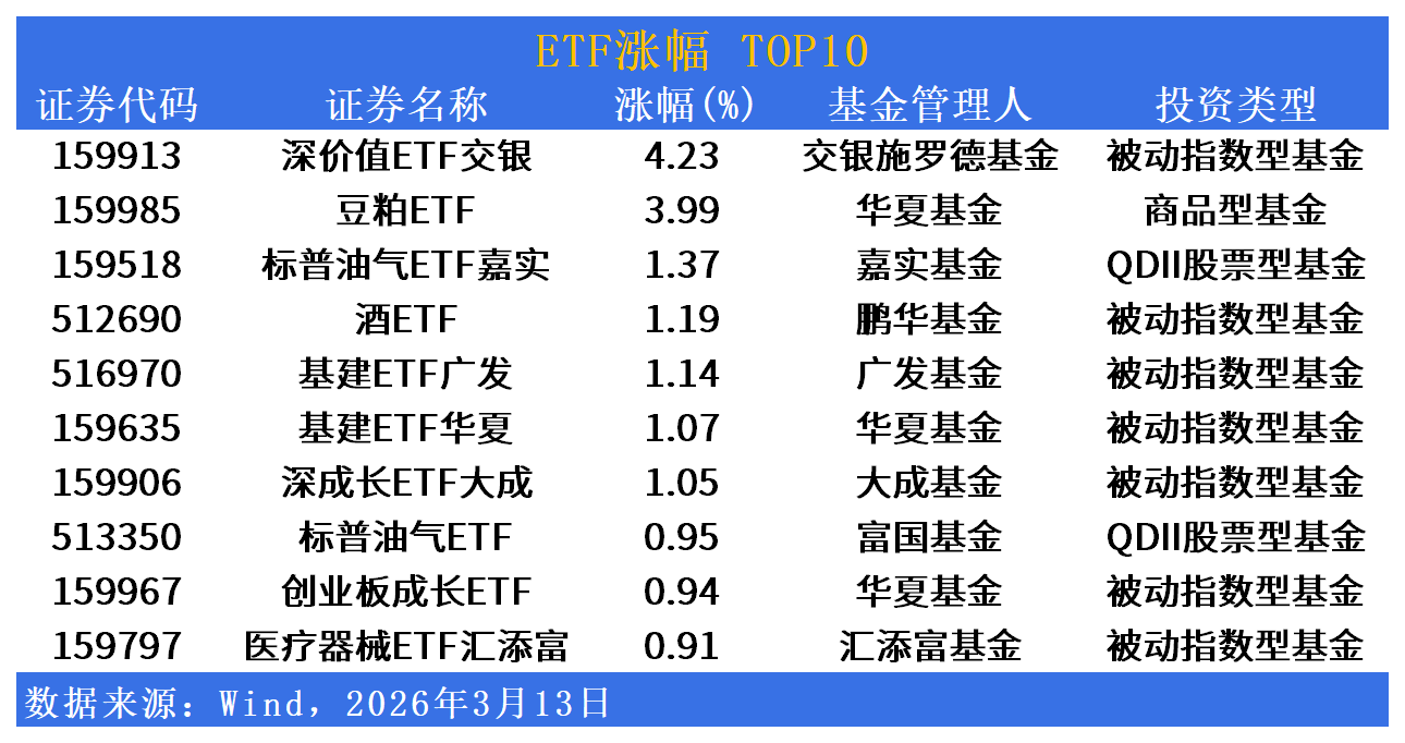 涨幅方面,深价值ETF大涨逾4%领涨,豆粕期货与基建板块同步走强