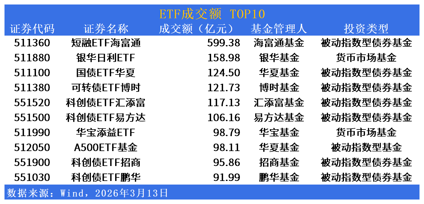 短融ETF海富通(511360)单日成交599.38亿元居首,银华日利ETF(511880)成交158.98亿元。债券ETF集群活跃,国债ETF华夏(511100)成交124.50亿元,可转债ETF博时(511380)成交121.73亿元,科创债ETF汇添富(551520)成交117.13亿元。