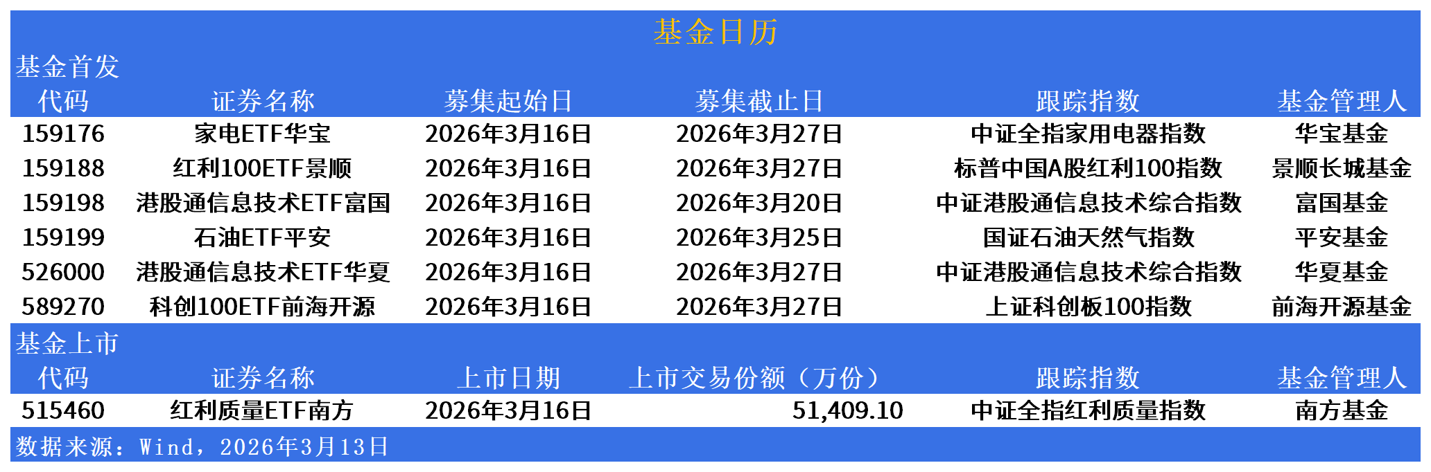 明日募集:家电ETF华宝(159176)、红利100ETF景顺(159188)、港股通信息技术ETF富国(159198)、石油ETF平安(159199)、港股通信息技术ETF华夏(526000)、科创100ETF前海开源(589270)均定于3月16日开募,募集期至3月20日至27日不等,分别跟踪中证全指家用电器指数、标普中国A股红利100指数、中证港股通信息技术综合指数、国证石油天然气指数及上证科创板100指数,覆盖家电、红利、港股科技、石油及科创板赛道。