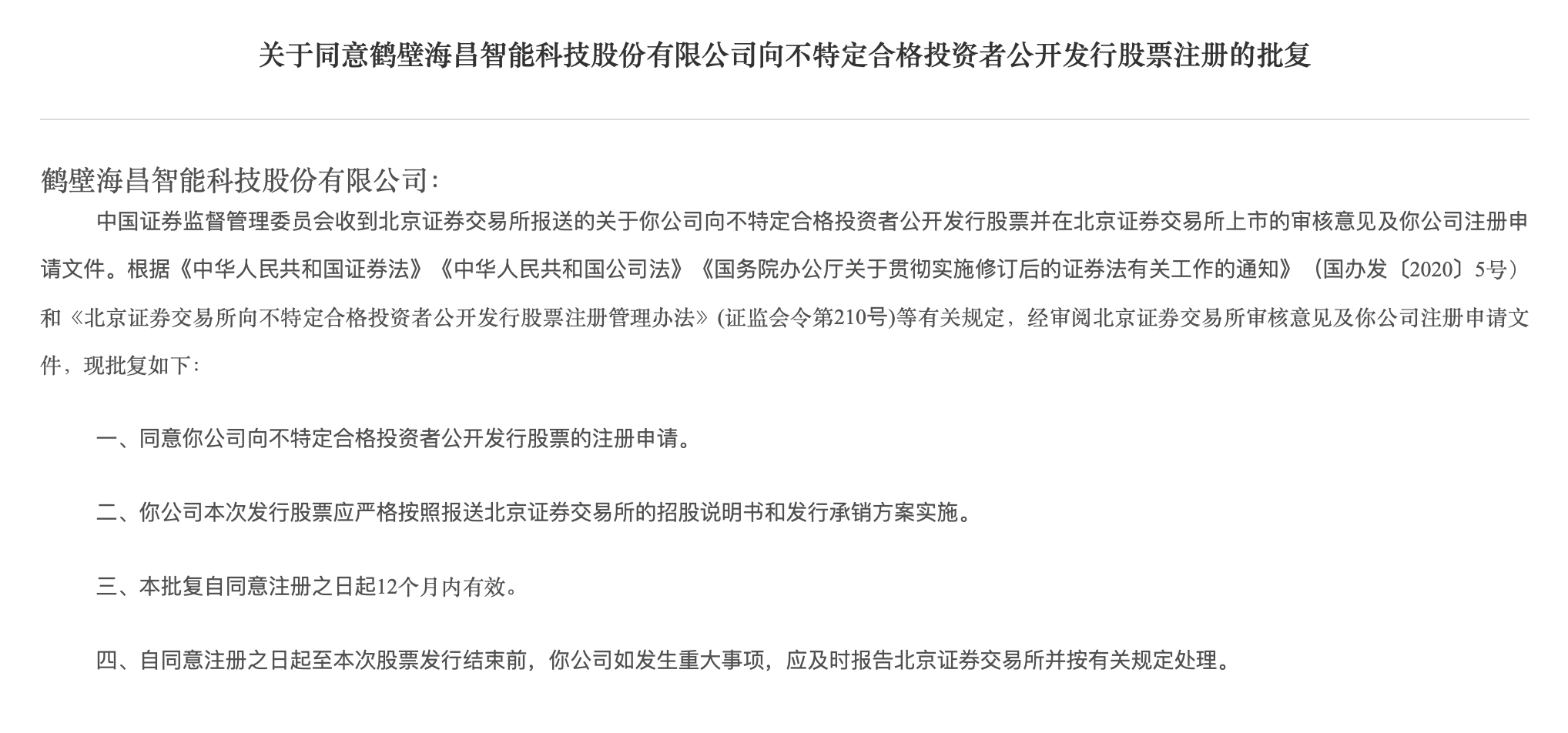 上证报中国证券网讯(记者 王乔琪)证监会日前批复,同意鹤壁海昌智能科技股份有限公司(简称“海昌智能”)向不特定合格投资者公开发行股票,并在北京证券交易所上市。该批复自同意注册之日起12个月内有效。