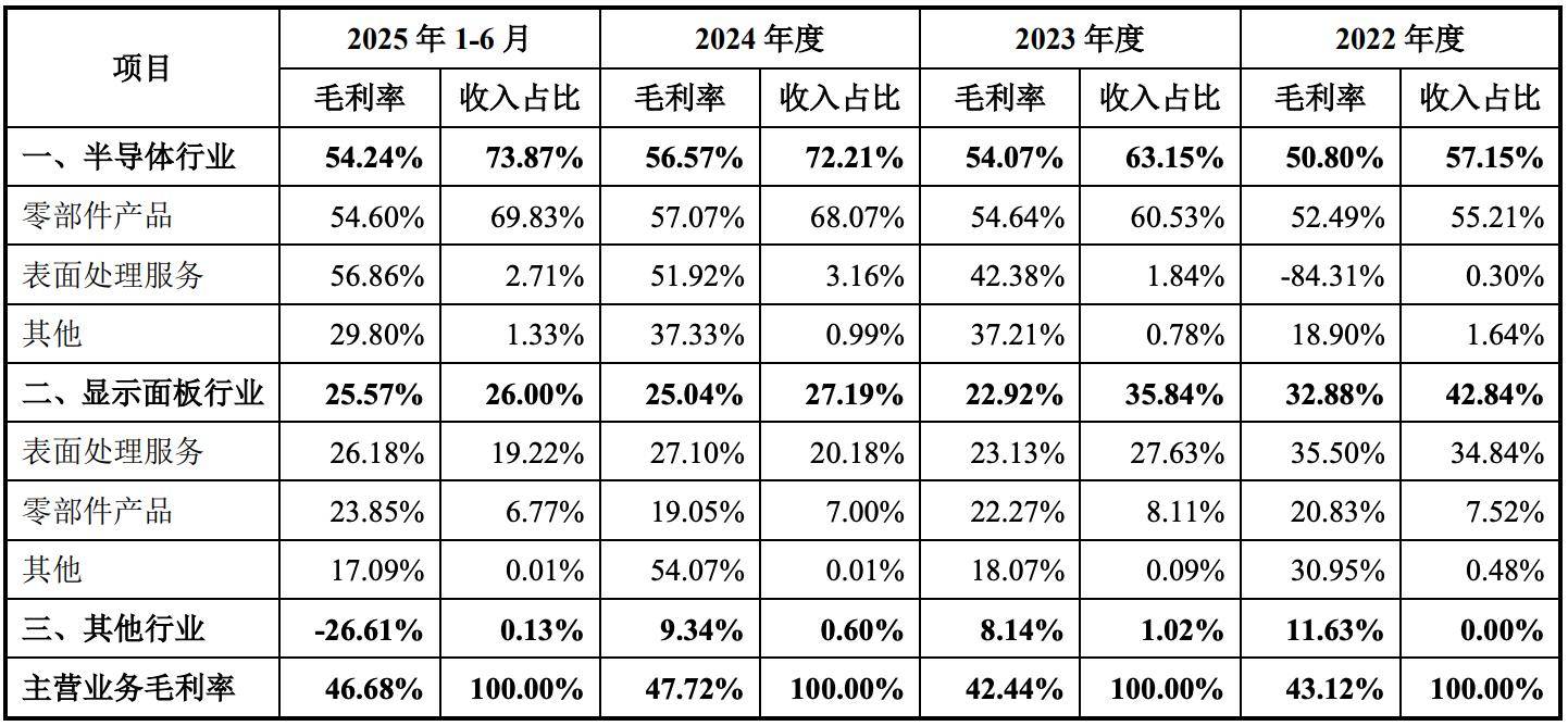 与此同时,公司业务结构也实现了关键转型。公司已从早期的显示面板业务为主,成功切换至更高壁垒的半导体赛道。报告期内,公司来自半导体行业的收入占比从2022年的57.15%提升至2024年的72.21%,2025年上半年进一步增至73.87%。