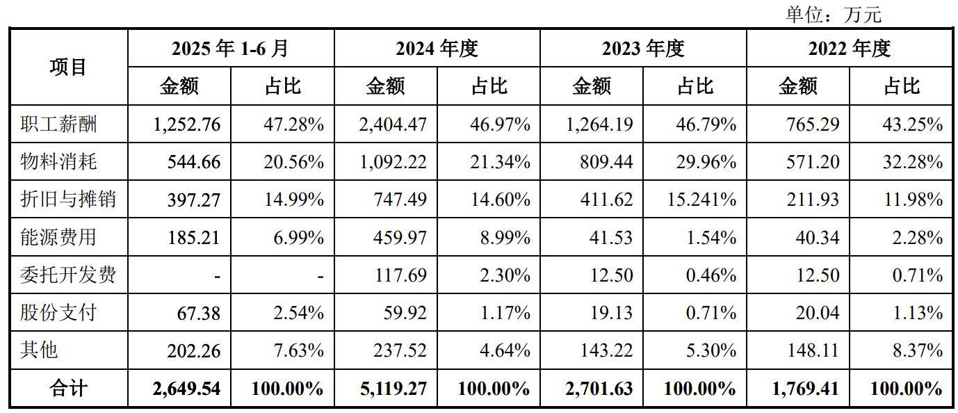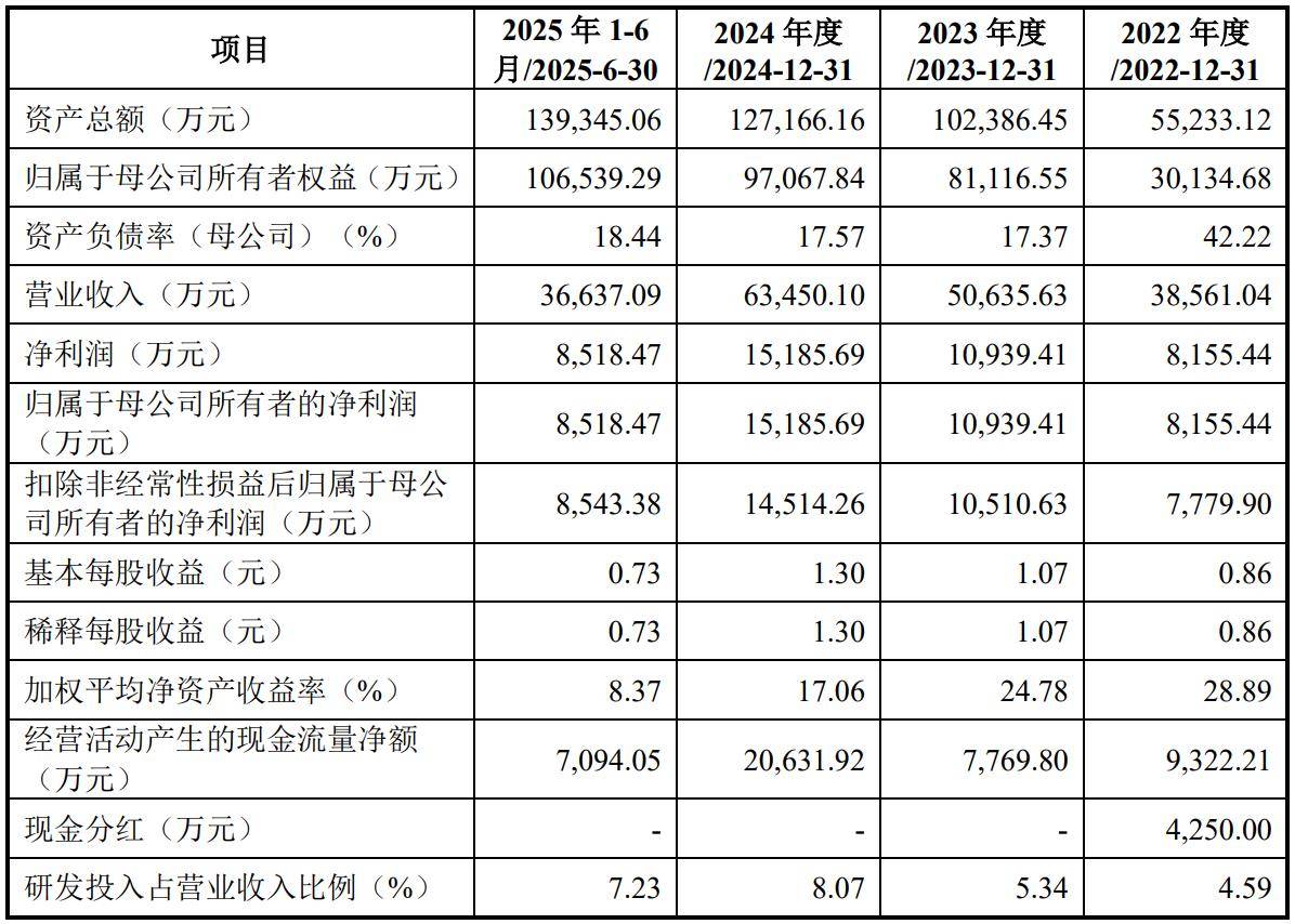 招股书显示,2022-2024年及2025年上半年,公司研发人员数量分别为38人、92人、113人、117人,占员工总数比例依次为5.58%、11.81%、13.23%、12.34%。2023年研发人员规模大幅增长,占比首次越过科创板“研发人员占比不低于10%”的监管要求。