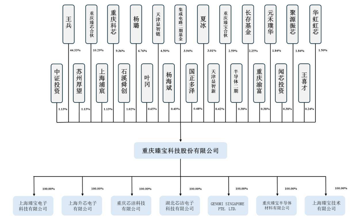 作为公司实际控制人,王兵直接持有臻宝科技44.33%的股份,并通过员工持股平台重庆臻芯合伙、重庆臻宝合伙分别控制公司10.29%、2.59%的股份,合计控制公司57.20%的表决权。
