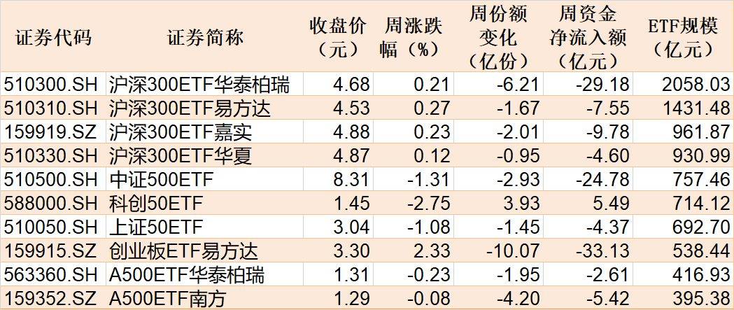 具体ETF方面,规模较大的10只宽基指数ETF本周合计净流出115.94亿元,其中创业板ETF易方达净流出33.13亿元。