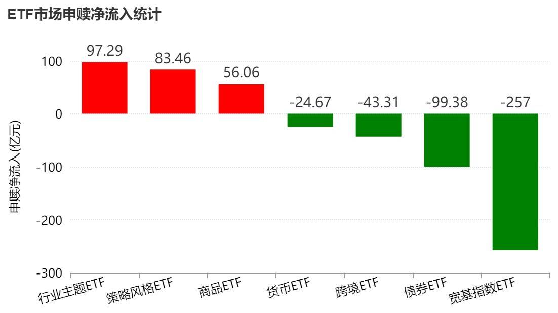 Wind数据显示,本周沪深两市股票型ETF和跨境型ETF合计净流出119.7亿元,宽基指数ETF净流出257亿元,行业主题ETF净流入97.3亿元。