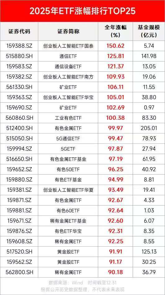 2025年场内ETF成绩,绝对要比基金的表现更为耀眼,其中有6只ETF涨幅超100%。而且通信ETF大涨125.81%夺冠,矿业ETF、创业板人工智能ETF华宝、有色矿业ETF招商和工业有色ETF等涨幅也超过100%。